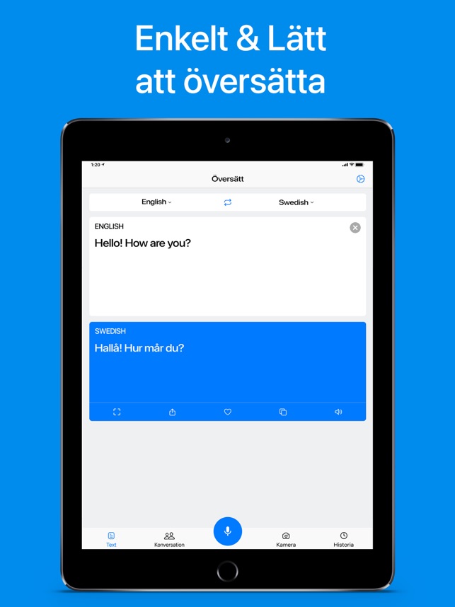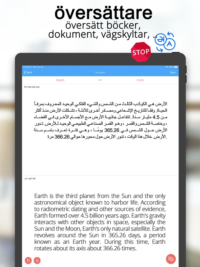 Översätta text på ett foto eller en bild. Appen för dig som vill skanna text och få den översatt till redigerbar text redo att skickas iväg direkt. Dutta på mitten ikonen.